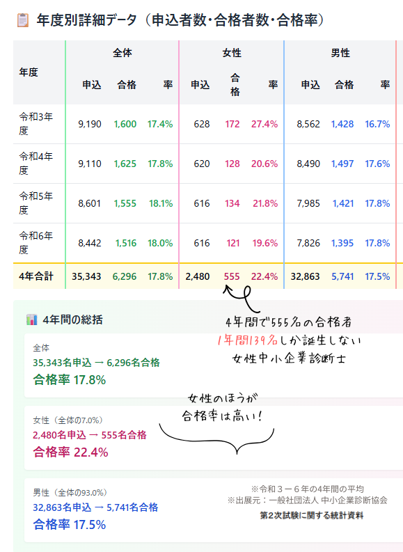 実際、令和3年〜6年の4年間で、中小企業診断士の2次試験に合格した女性はたった555人。