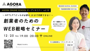 今日は12月25日。クリスマス当日の夜、町田AGORA主催の創業向け「Webマーケティングセミナー」を、オンラインで開催しました。 このセミナーは、創業期に必要なWebマーケティングを、ツール選びの視点から整理することを […]